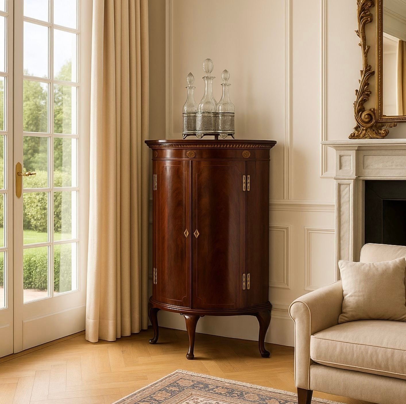 Antica angoliera giorgiana, inglese, in mogano, finemente intarsiata con legni di frutto, molto elegante e raffinata è del 1780 c. All’interno ci sono tre ripiani originali dell’epoca e il piano superiore si apre rivelando uno spazio nascosto.