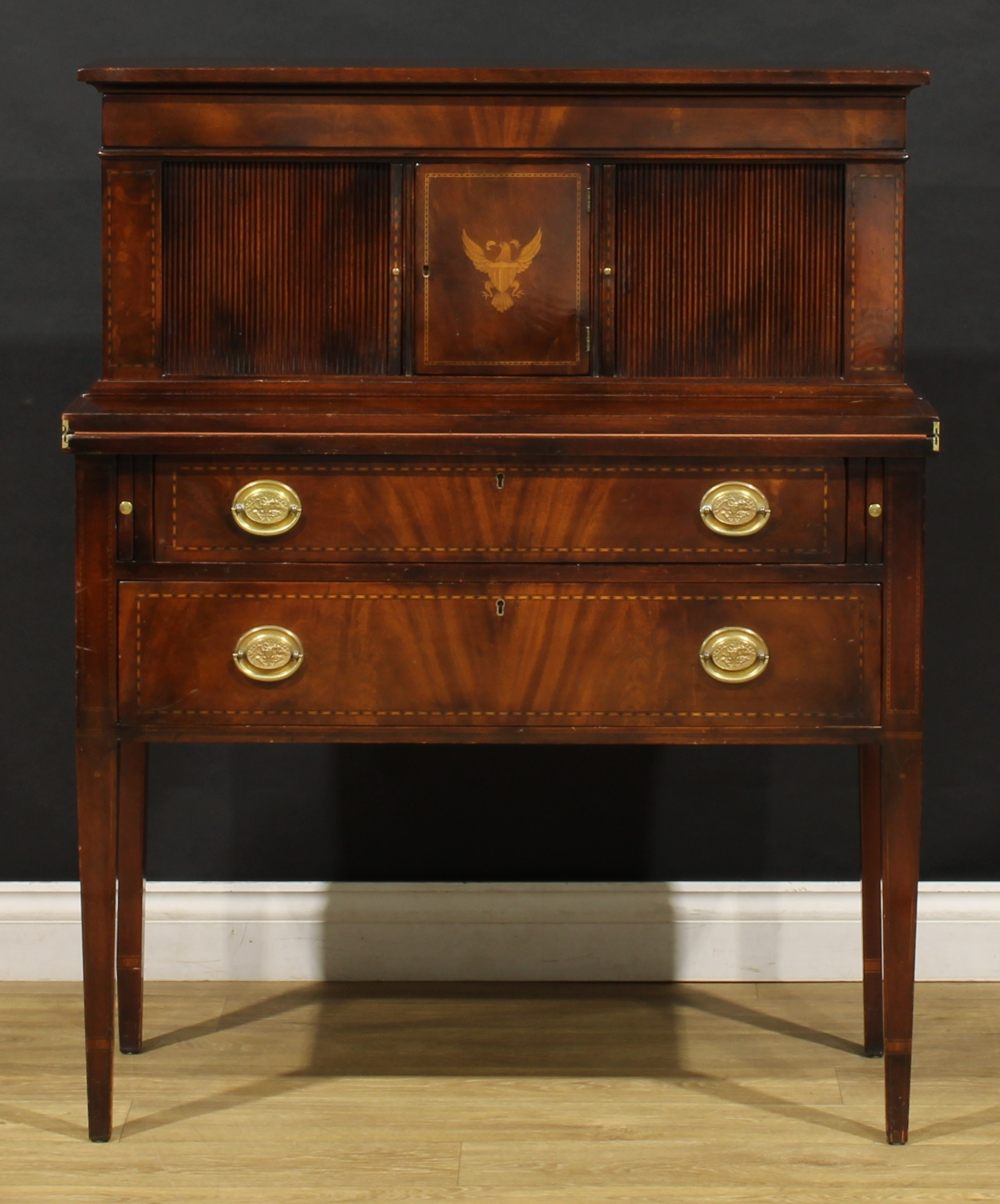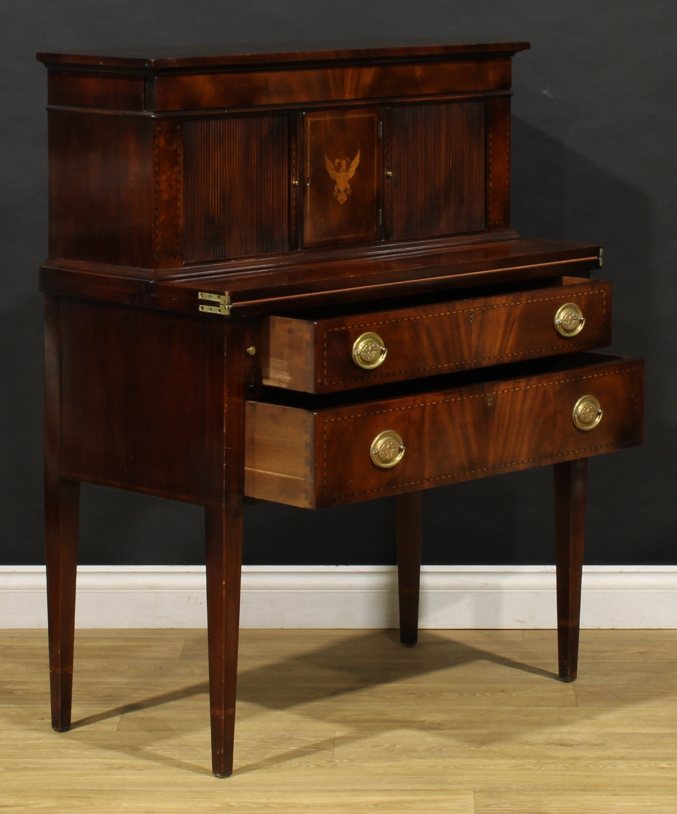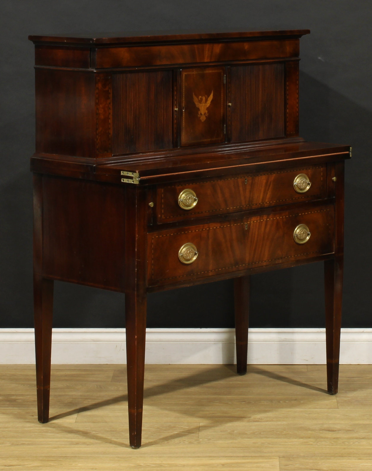 Elegante bonheur du jour americano in mogano e intarsio, appartenente alla Beacon Hill Collection (Piece Number 83), ispirato al raffinato stile Federal di fine Settecento. La parte superiore presenta una sovrastruttura con ante a serrandina (tambour) e un cassetto sottostante, mentre al centro si apre uno sportello impreziosito da un fine intarsio raffigurante un’aquila, simbolo iconico degli Stati Uniti. La parte inferiore, leggermente aggettante, cela un piano a ribalta richiudibile che funge da scrittoio, al di sotto del quale si trovano due ampi cassetti con maniglie ovali in ottone cesellate con aquile federali. L’intero mobile è arricchito da una filettatura a intarsio geometrico che ne sottolinea le linee eleganti e proporzionate. Le gambe affusolate a sezione quadrata conferiscono slancio e leggerezza alla struttura. Un esempio di maestria artigianale americana che unisce funzionalità e gusto neoclassico, perfetto come scrittoio o mobile da salotto. Etichetta originale all’interno: Beacon Hill Collection (Reg. U.S. Pat. Office), Piece Number 83.