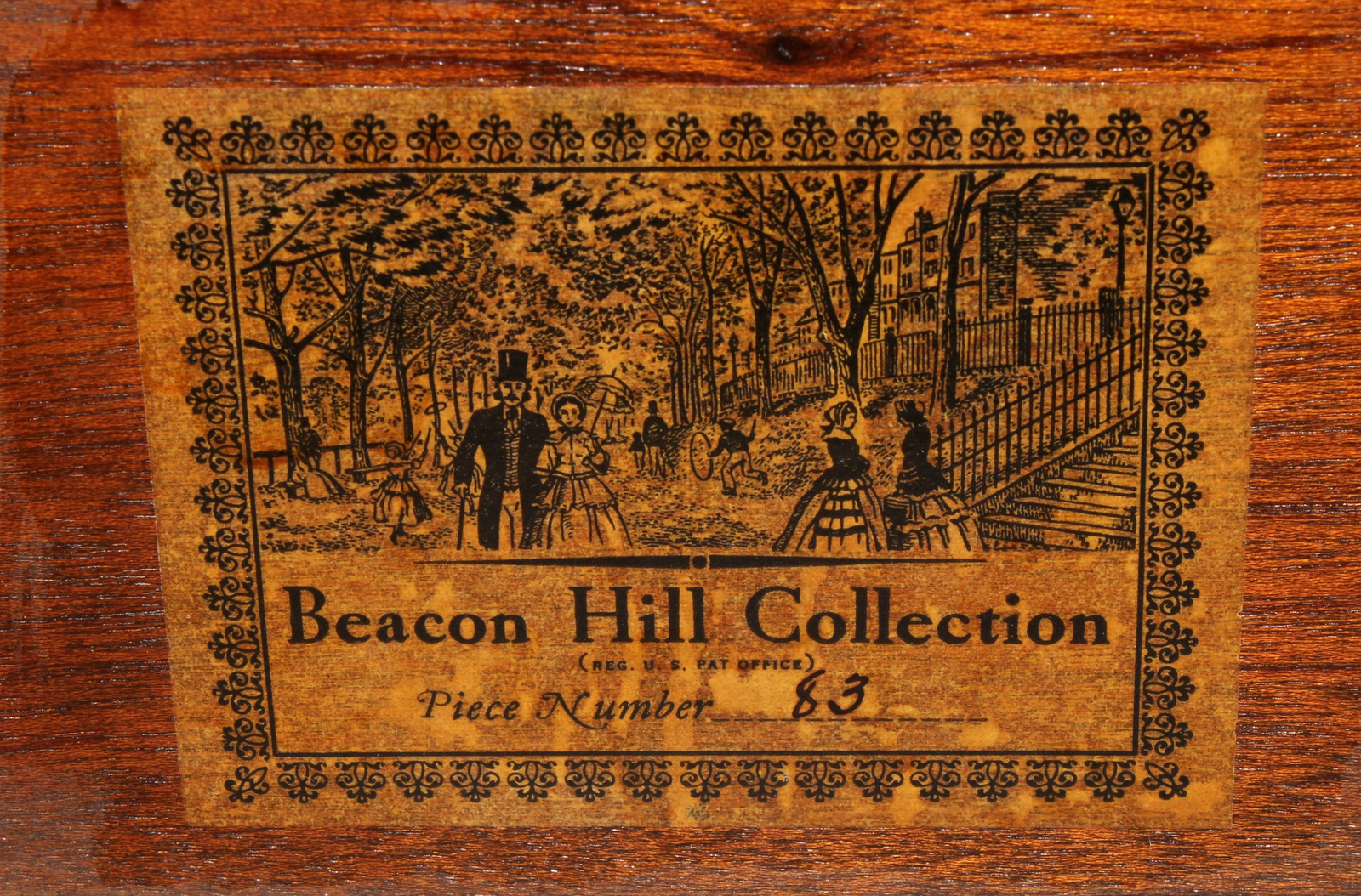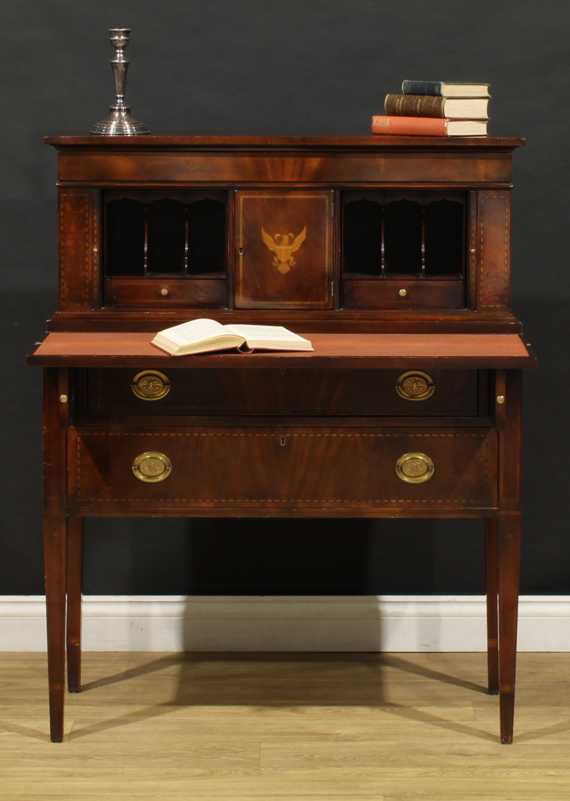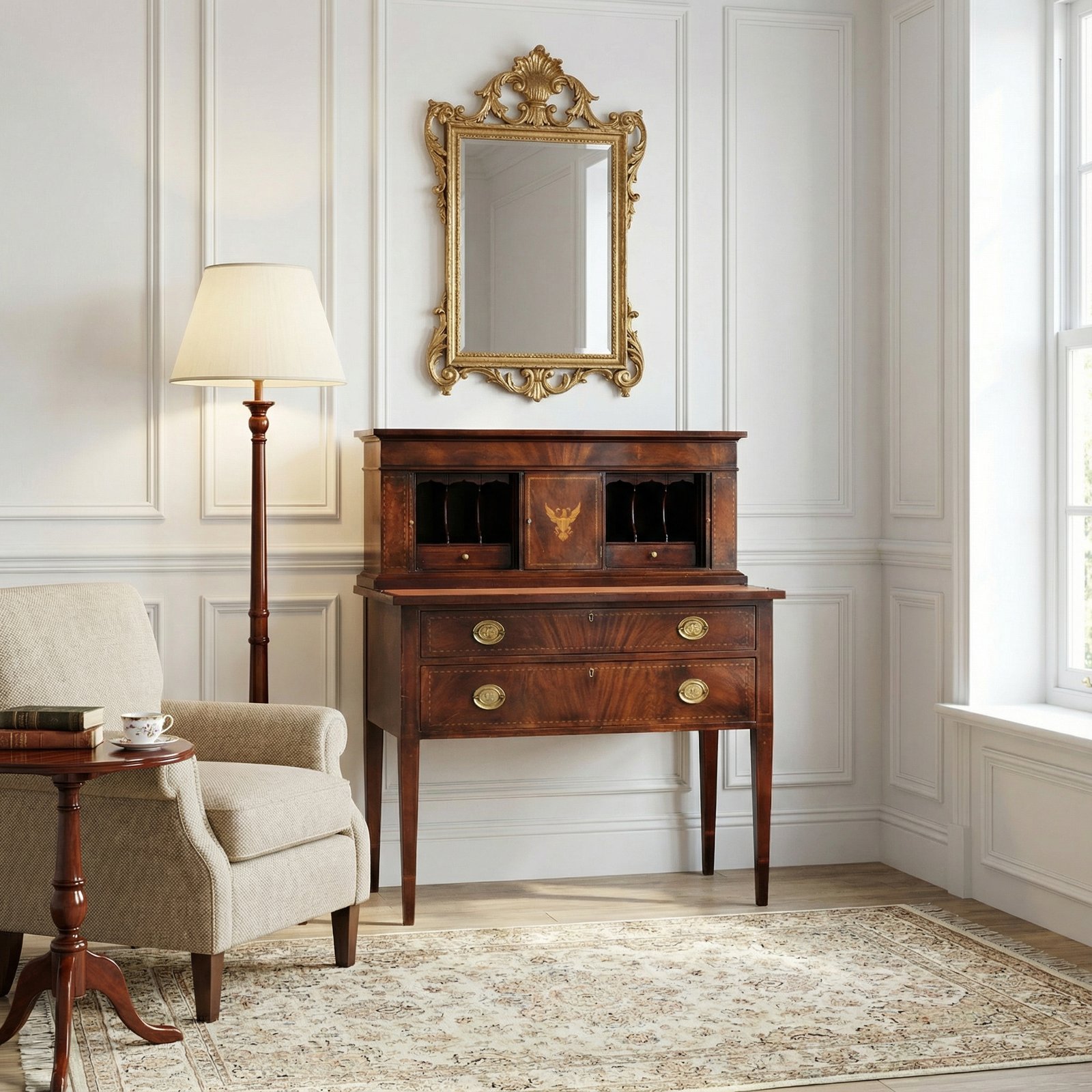 Elegante bonheur du jour americano in mogano e intarsio, appartenente alla Beacon Hill Collection (Piece Number 83), ispirato al raffinato stile Federal di fine Settecento. La parte superiore presenta una sovrastruttura con ante a serrandina (tambour) e un cassetto sottostante, mentre al centro si apre uno sportello impreziosito da un fine intarsio raffigurante un’aquila, simbolo iconico degli Stati Uniti. La parte inferiore, leggermente aggettante, cela un piano a ribalta richiudibile che funge da scrittoio, al di sotto del quale si trovano due ampi cassetti con maniglie ovali in ottone cesellate con aquile federali. L’intero mobile è arricchito da una filettatura a intarsio geometrico che ne sottolinea le linee eleganti e proporzionate. Le gambe affusolate a sezione quadrata conferiscono slancio e leggerezza alla struttura. Un esempio di maestria artigianale americana che unisce funzionalità e gusto neoclassico, perfetto come scrittoio o mobile da salotto. Etichetta originale all’interno: Beacon Hill Collection (Reg. U.S. Pat. Office), Piece Number 83.