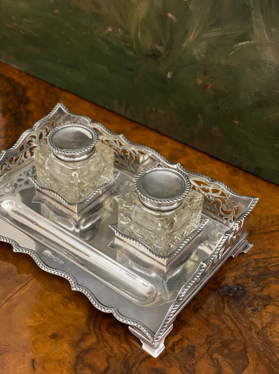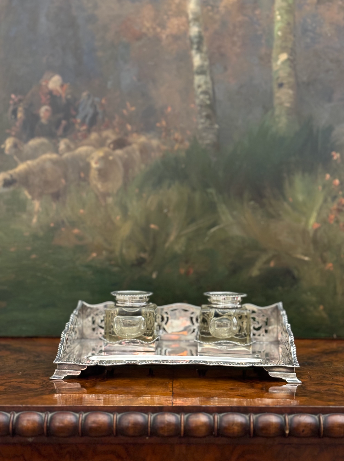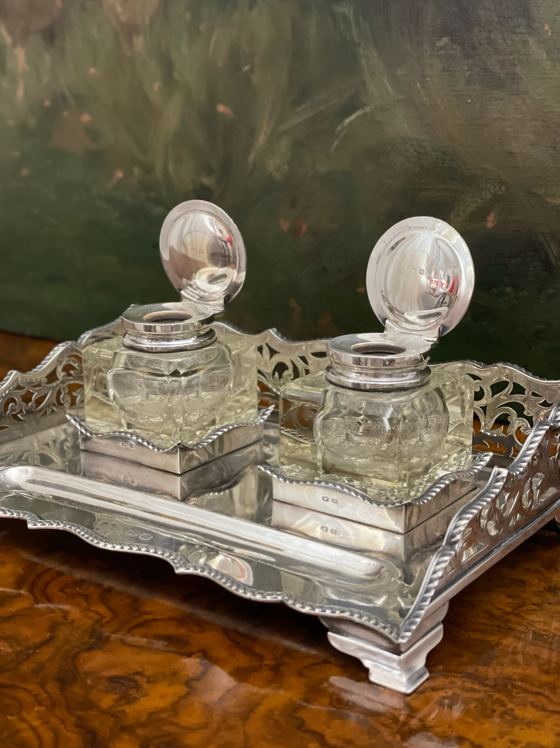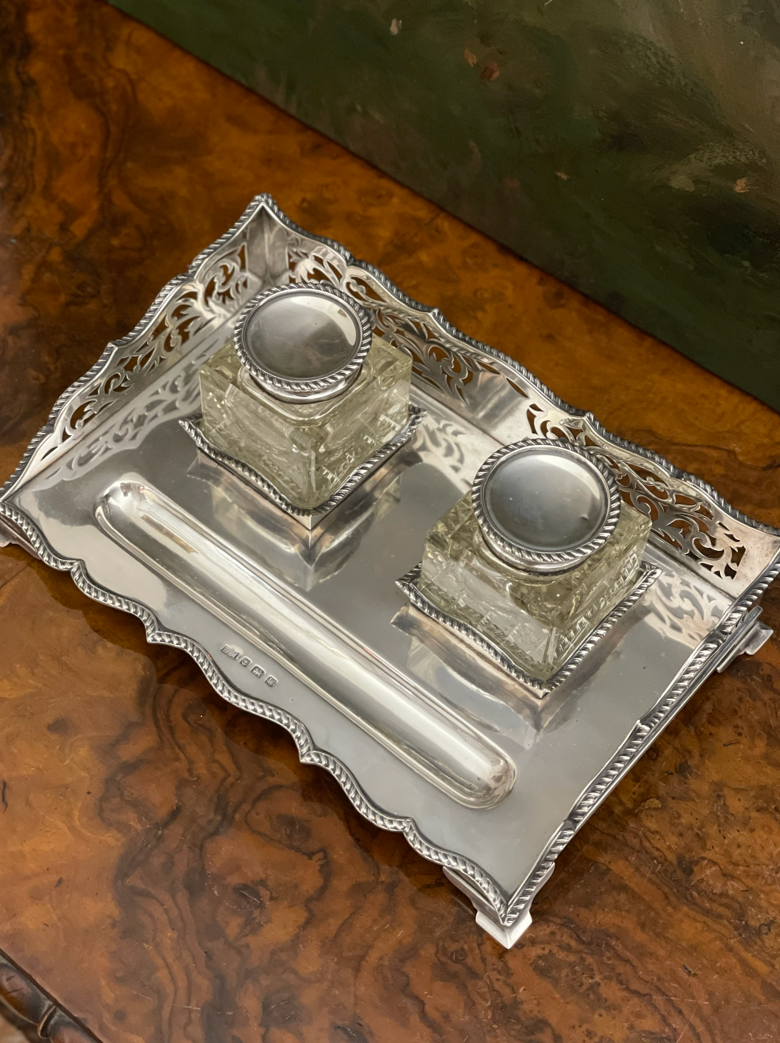 Calamaio con ringhierina traforata a mano, con motivi floreali. Il bordo è rifinito a “cordone” ed è mosso, e così anche le griglie che contengono le due boccette porta inchiostro, in cristallo al piombo molato a mano (sane e originali). Anche i coperchi delle boccette, che si aprono a cerniera, sono rifiniti con una bordura a “cordone”. I piedini sono a “mensola”. Questo calamaio presenta la cartuche libera, per cui c’è la possibilità di inserire, volendo, delle iniziali.Metodi di pagamento