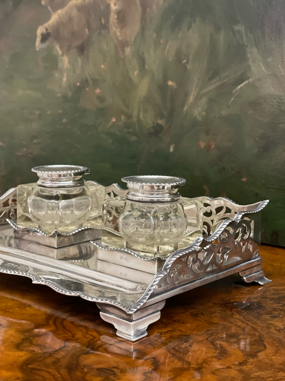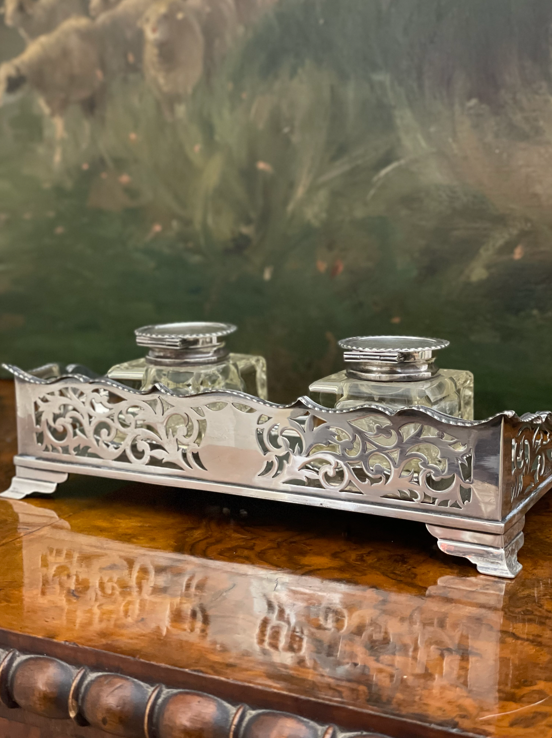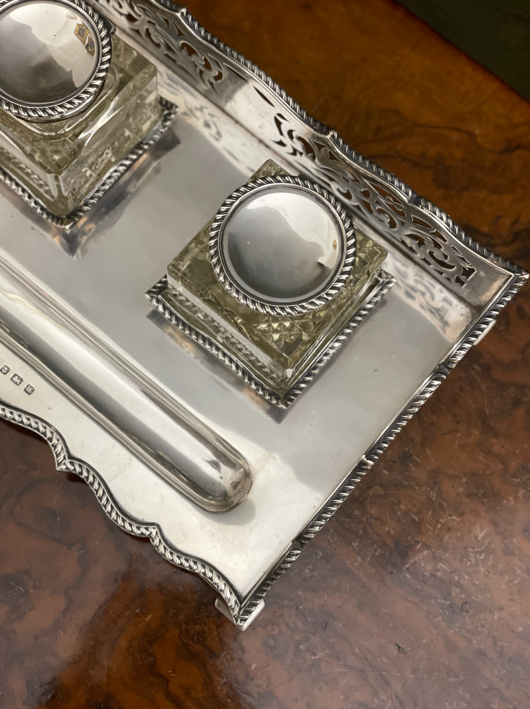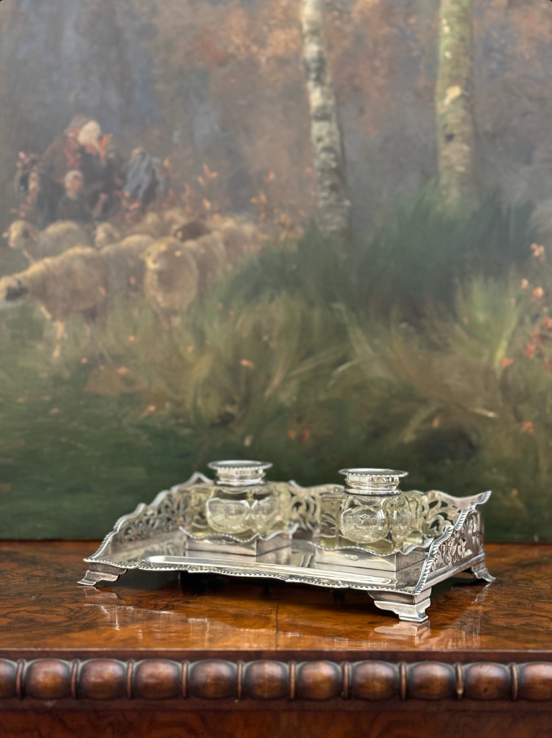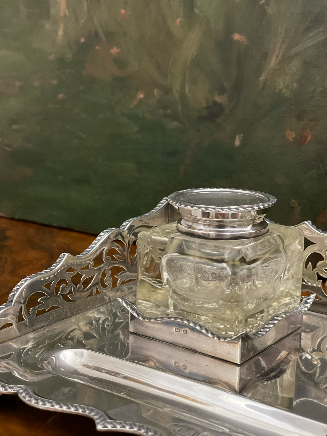 Calamaio con ringhierina traforata a mano, con motivi floreali. Il bordo è rifinito a “cordone” ed è mosso, e così anche le griglie che contengono le due boccette porta inchiostro, in cristallo al piombo molato a mano (sane e originali). Anche i coperchi delle boccette, che si aprono a cerniera, sono rifiniti con una bordura a “cordone”. I piedini sono a “mensola”. Questo calamaio presenta la cartuche libera, per cui c’è la possibilità di inserire, volendo, delle iniziali.Metodi di pagamento