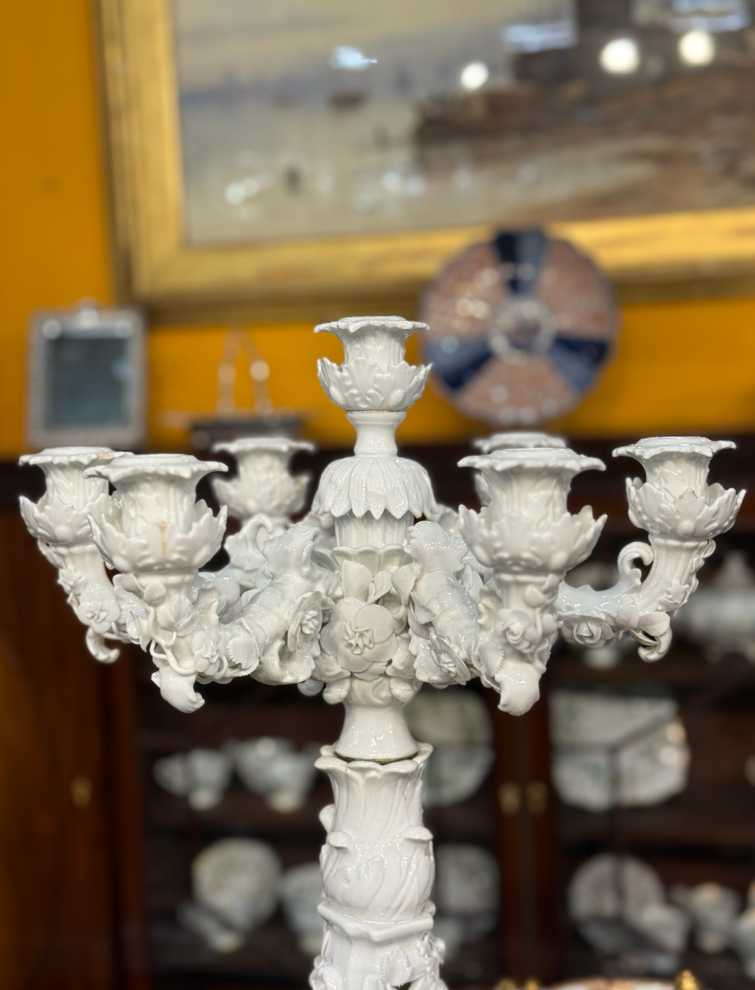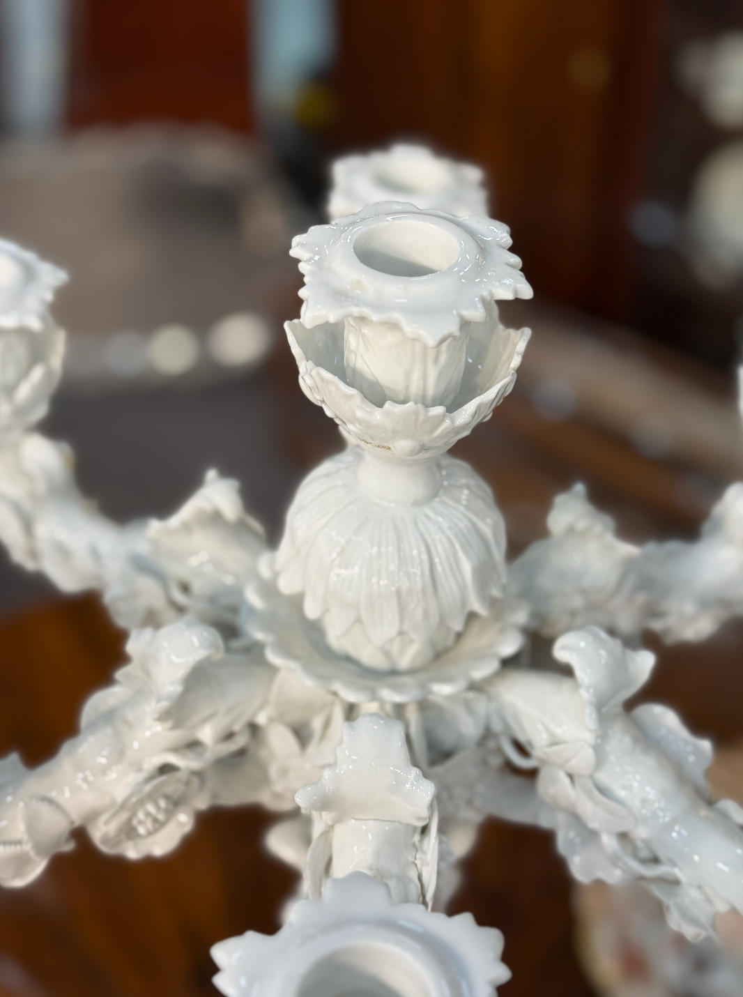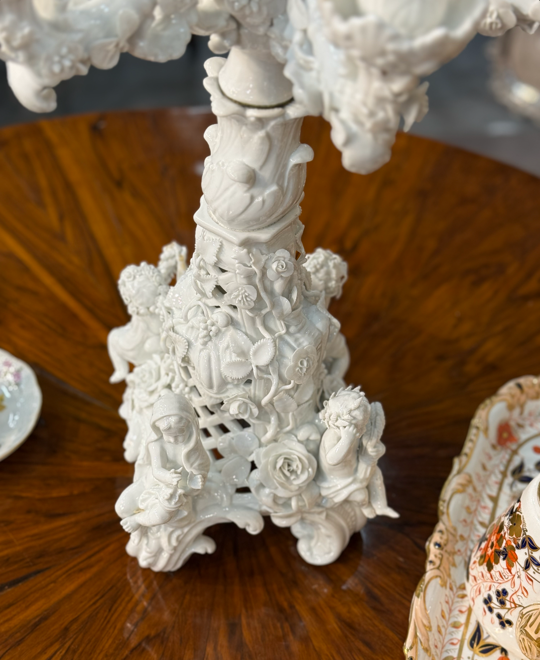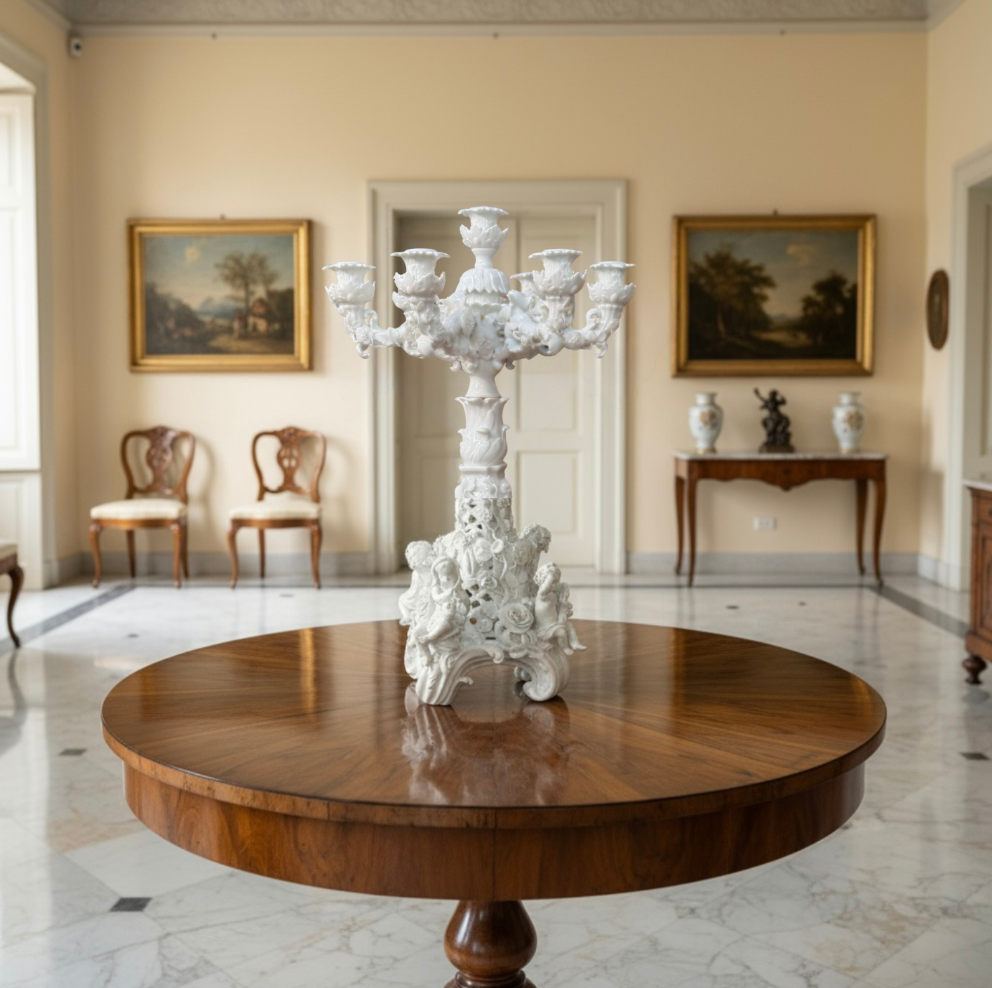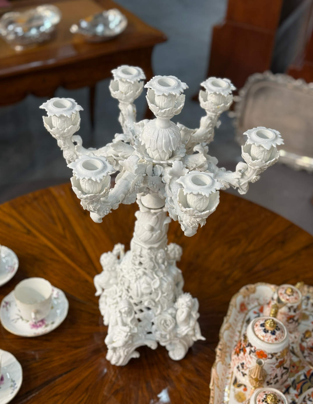 Raffinato candelabro in porcellana bianca realizzato dalla celebre manifattura Meissen. Il corpo centrale, è decorato con putti e tralci floreali che si intrecciano con grande eleganza. Un autentico capolavoro di porcellana tedesca ottocentesca, perfetto per impreziosire un salone, una tavola importante o una collezione di pregio.