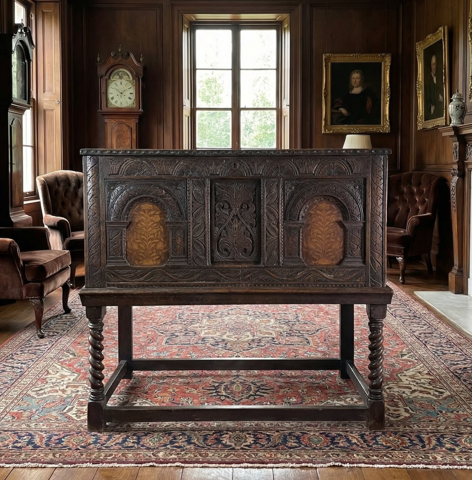 Antica cassapanca in rovere finemente intarsiata e intagliata, con supporto da terra (removibile) autentico e originale decorato con gambe a torchon. È in buonissime condizioni e presenta la serratura e le cerniere originali.Metodi di pagamento