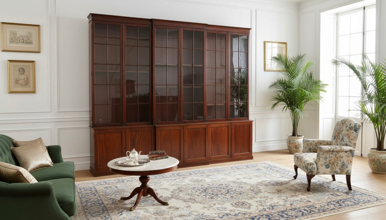 Grande libreria in piuma di mogano “breakfront”, giorgiana, con vetri originali e sei ante a vetrata sulla parte superiore.