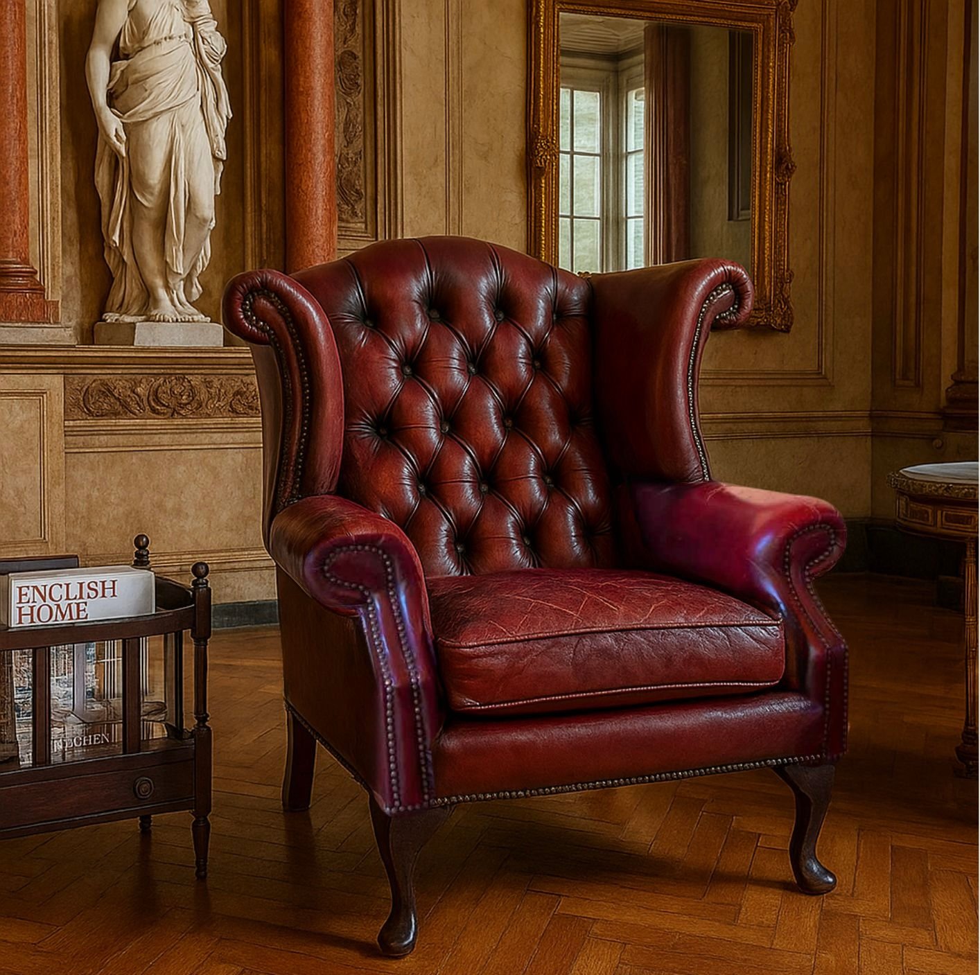 Comodissima poltrona Chesterfield a schienale alto, in pelle rosso scuro, modello “Queen Ann”. Originale degli anni ’50, ha una struttura molto solida e un aspetto vintage che le dona fascino e calore.Metodi di pagamento