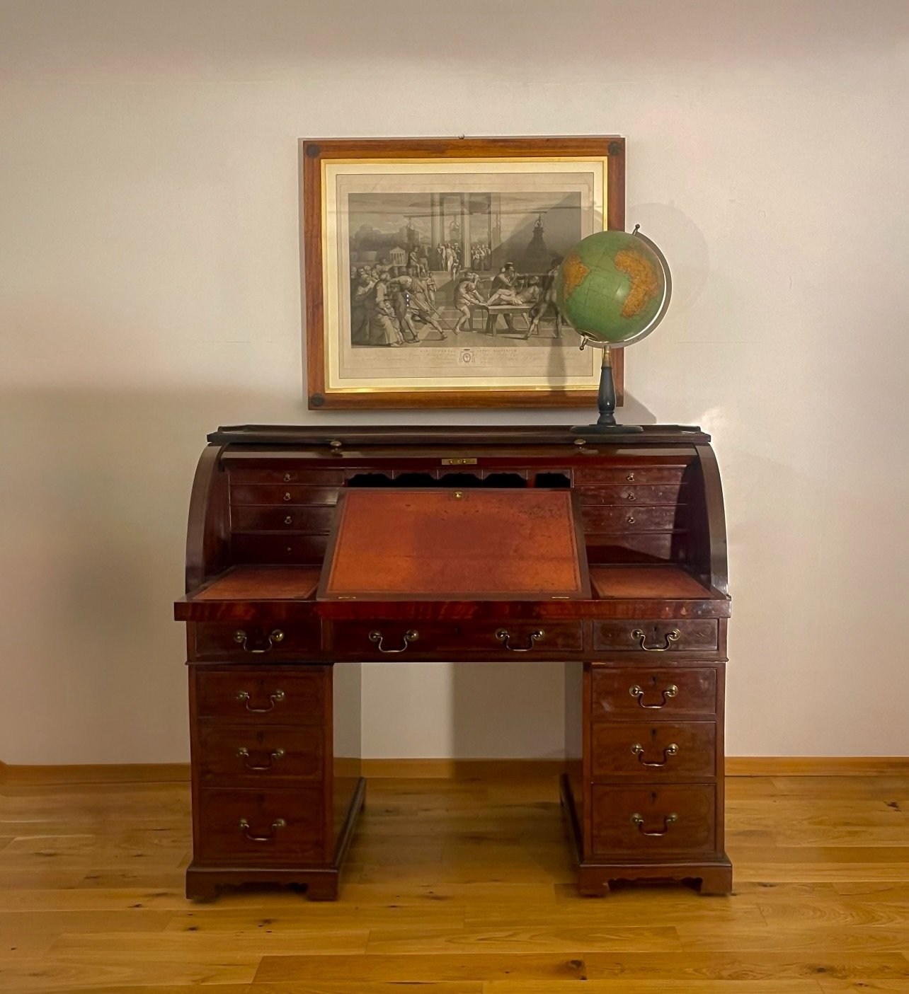 Importante e signorile scrivania con chiusura a rullo, in mogano con intarsi in ebano. Il piano interno è rivestito in pelle e la parte centrale del piano può essere posizionata a diverse altezze e utilizzata come leggio.Metodi di pagamento