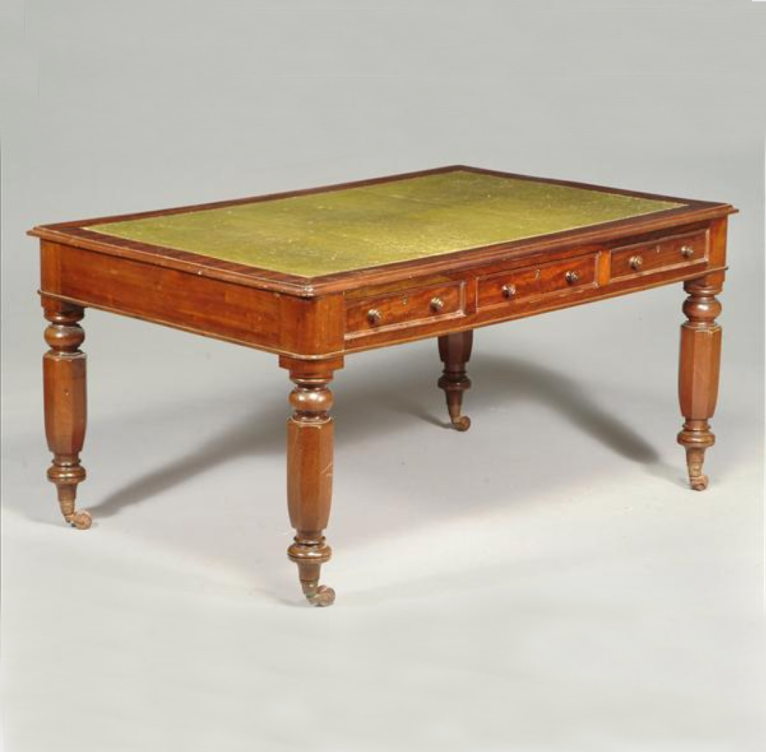 Antico e raro tavolo/scrittoio da studio del primo periodo vittoriano, in mogano e piuma di mogano, con 6 cassetti (3 per lato, quindi tavolo da centro). Piano in pelle verde con greca dorata, gambe esagonali tornite con alternanza di lavorazione a boccia.