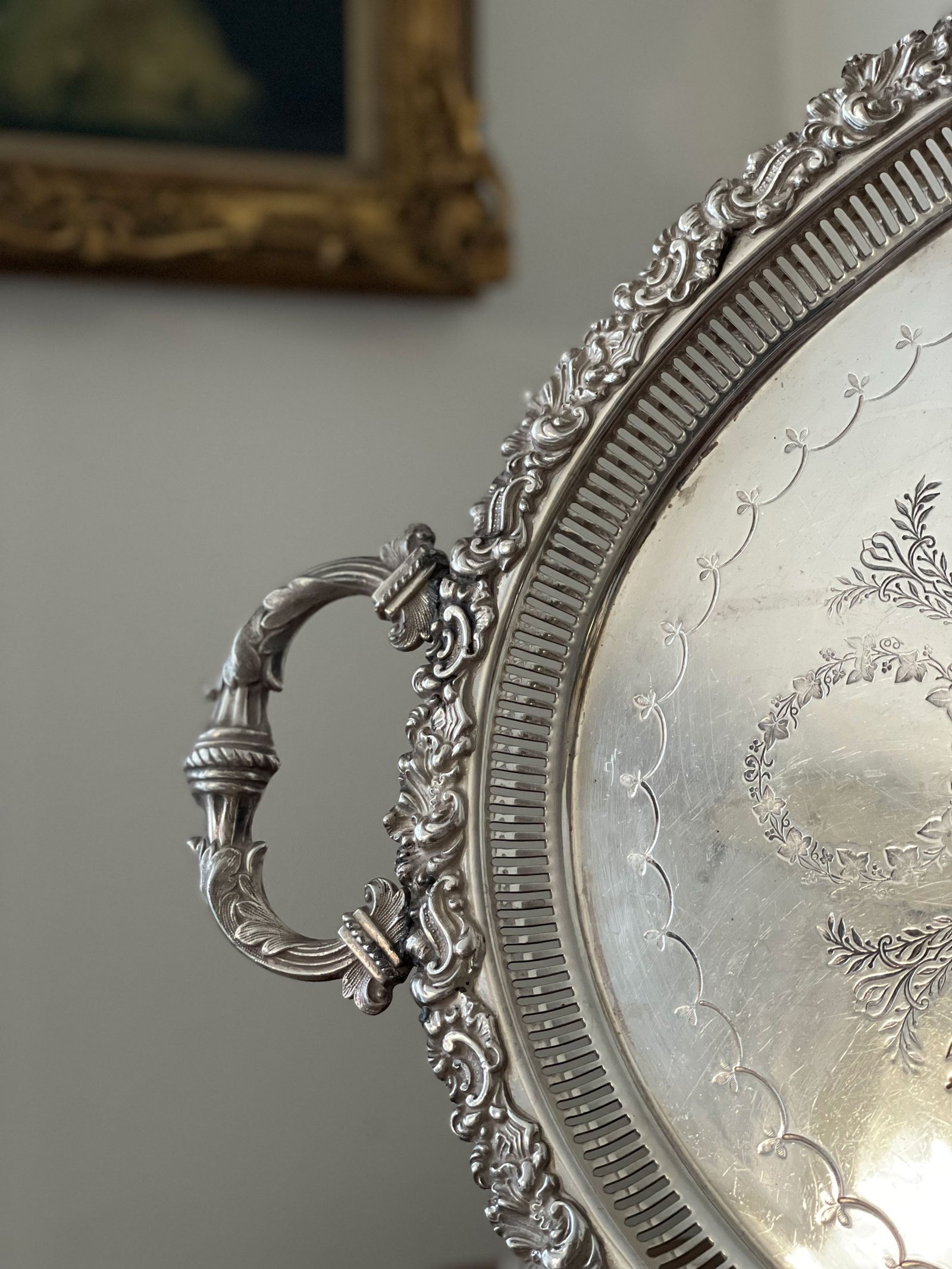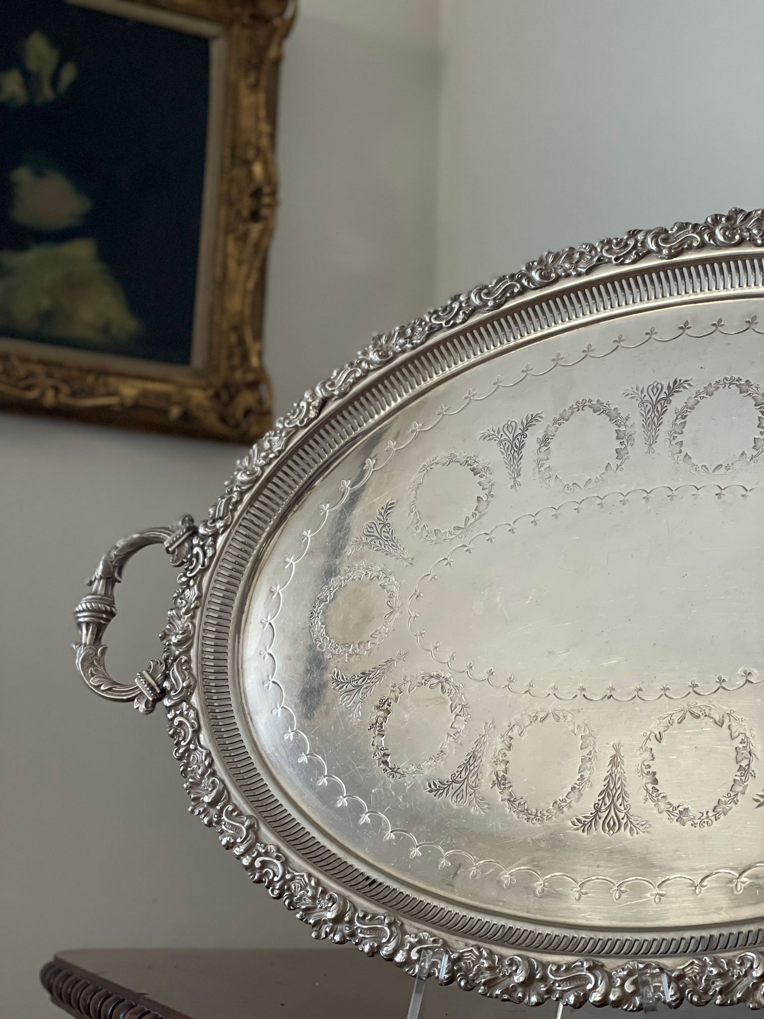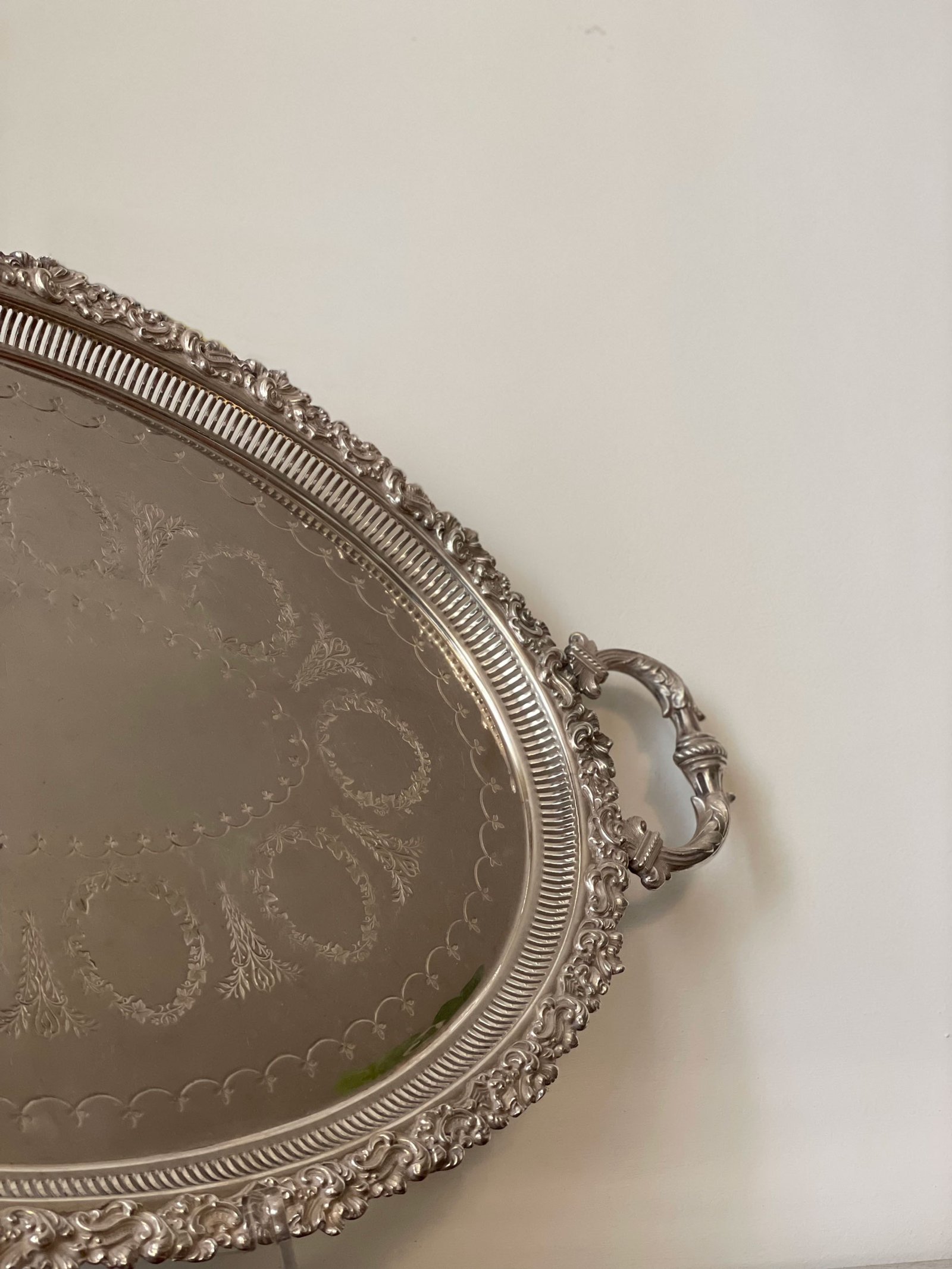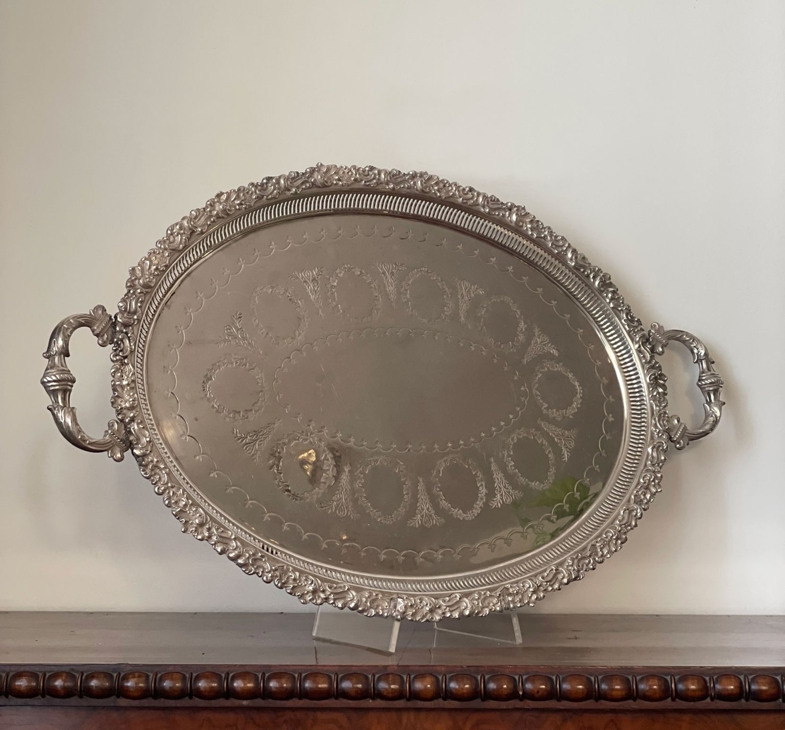 Grande vassoio ovale in sheffield, di tarda epoca vittoriana, con manici, finemente cesellato e sbalzato a mano. Al centro del vassoio è possibile far incidere delle iniziali.Metodi di pagamento